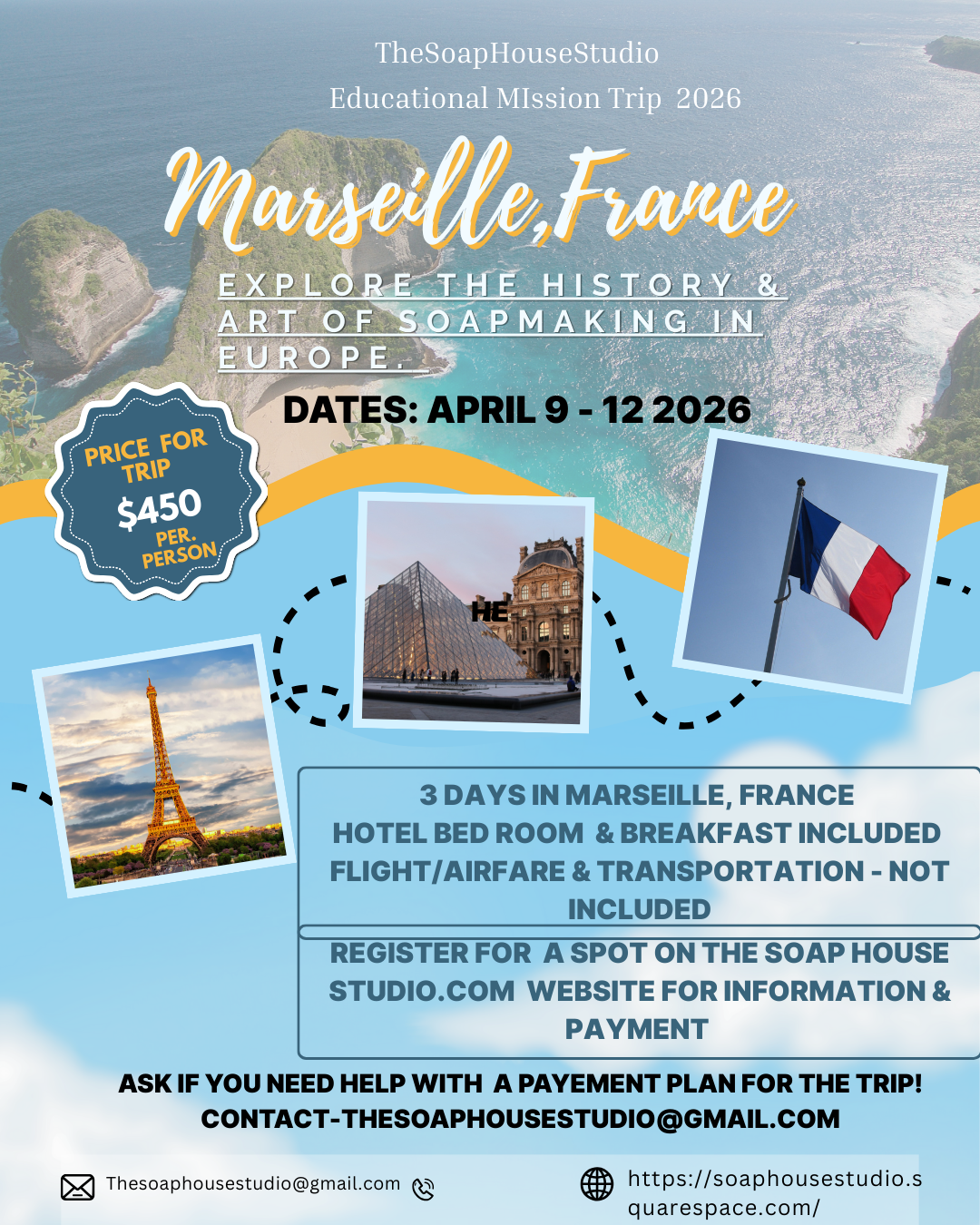 Shop the collection Educational Mission Trip Registration Link-Marseille, France Marseille, France Educational Mission Trip $450.00 Add To Cart Added! Have Questions?thesoaphousestudio@gmail.com Name * First Name Last Name Email * Thank you!